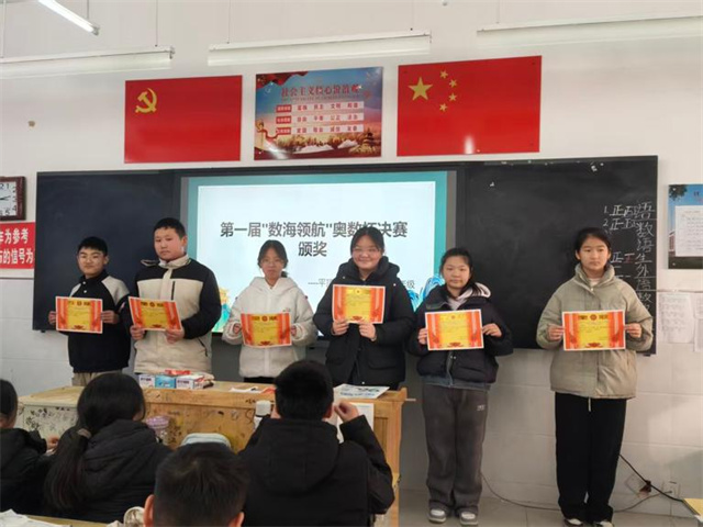 近日,首届“数海领航”奥数杯决赛颁奖仪式隆重举行。教室内气氛热烈,获奖学生们依次走上台前,手持金灿灿的奖状,脸上洋溢着自豪与喜悦。屏幕上“第一届‘数海领航’奥数杯决赛颁奖”的字样醒目亮眼,背景中鲜艳的党旗与国旗,更让这场表彰增添了奋进向上的底色。台下同学掌声不断,既是对获奖者的祝贺,也燃起了自身钻研数学的热情。
